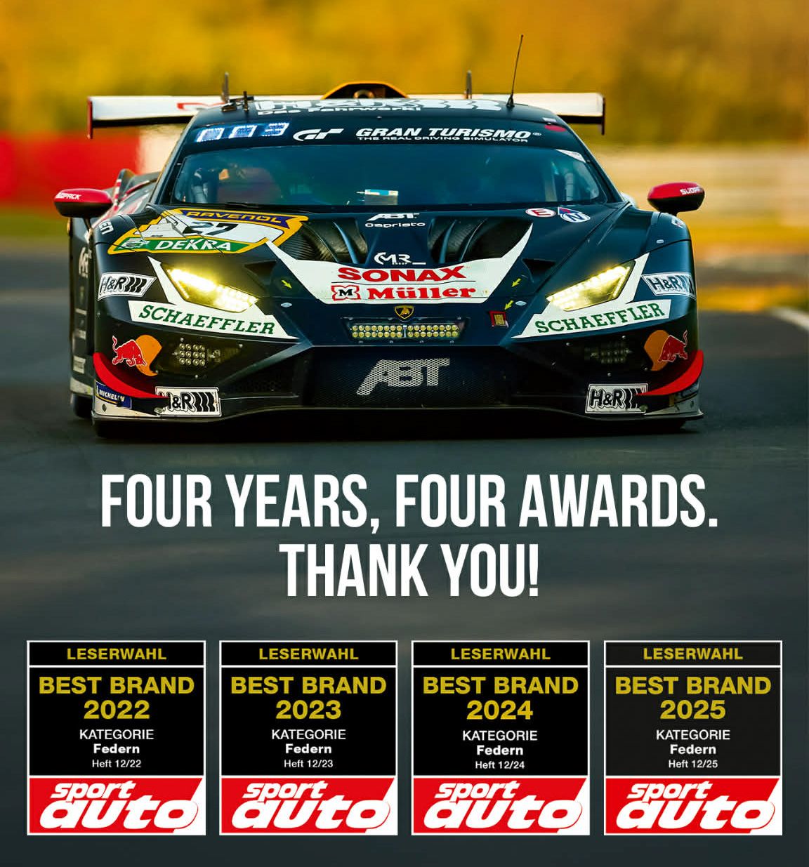 Lennestadt, Germany — [11/13/2025] — H&R Special Springs is proud to announce that we have been named “Best Brand” in the springs category by “Sport Auto” magazine for the fourth year in a row. This continued recognition stands as a testament to the trust, loyalty, and passion of our customers and automotive community worldwide.